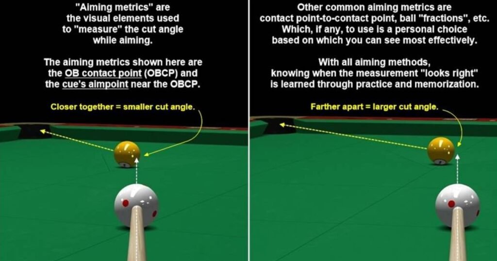 It needs to be mentioned that the method is applied only for the case of the perfect alignment. In some cases, especially in case of the cut strokes, the edge of the cue ball is utilized instead of its center. While it may sound weird in the first place, one can easily get used to the angle after enough training.