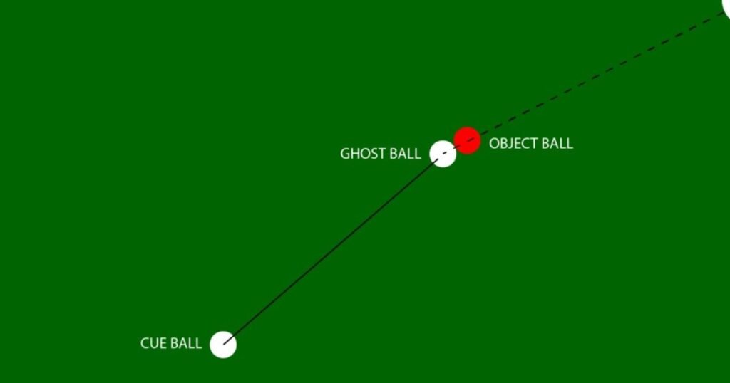 During the process of preparing for the shot, the player imagines the existence of the cue ball located right behind the object ball along the alignment to the pocket. The cue ball imagined in the above situation is known as the ghost ball. By taking the place of the ghost ball and hitting the object ball along the above line, the latter should move straight into the pocket.